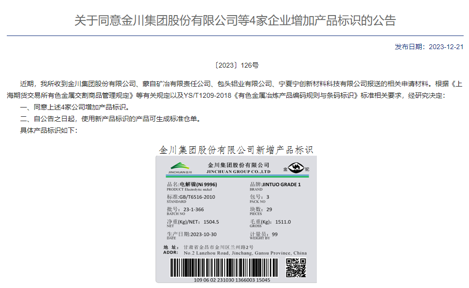 12月21日,據(jù)上海期貨交易所一則《關(guān)于同意金川集團(tuán)股份有限公司等4家企業(yè)增加產(chǎn)品標(biāo)識(shí)的公告》稱,金川集團(tuán)股份有限公司即日起使用新產(chǎn)品標(biāo)識(shí)的產(chǎn)品(品名:電解鎳NI9996)可生成標(biāo)準(zhǔn)倉(cāng)單。